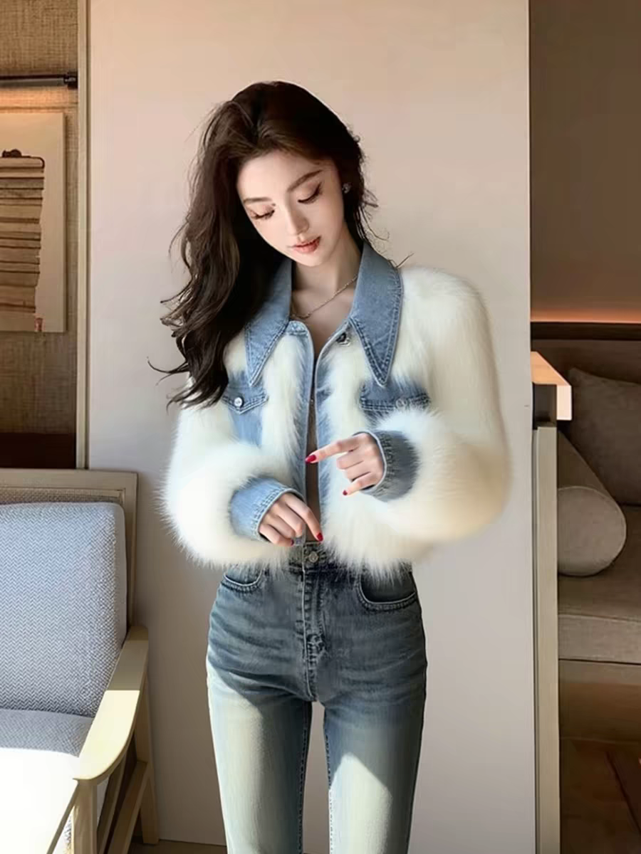 小香风牛仔拼接毛绒外套女装2025冬季加厚气质高级感轻熟百搭上衣