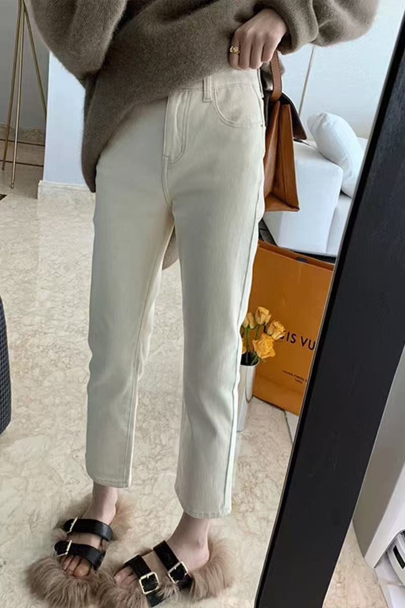 csk丘比特小细腿秋冬加绒米白色直筒牛仔裤女高腰显瘦百搭烟管裤
