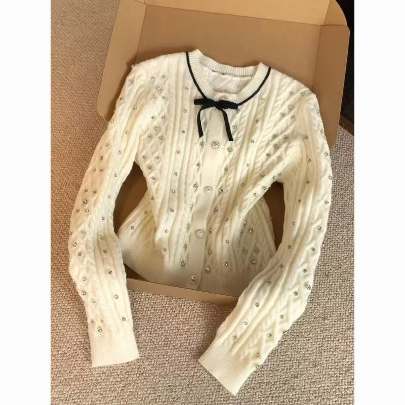 小香风名媛温柔针织蝴蝶结开衫上衣千金秋冬气质白色短款毛衣外套
