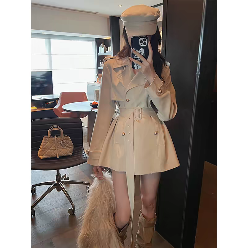 2026春季新款英伦风翻领双排扣收腰系带卡其色风衣女气质短款外套